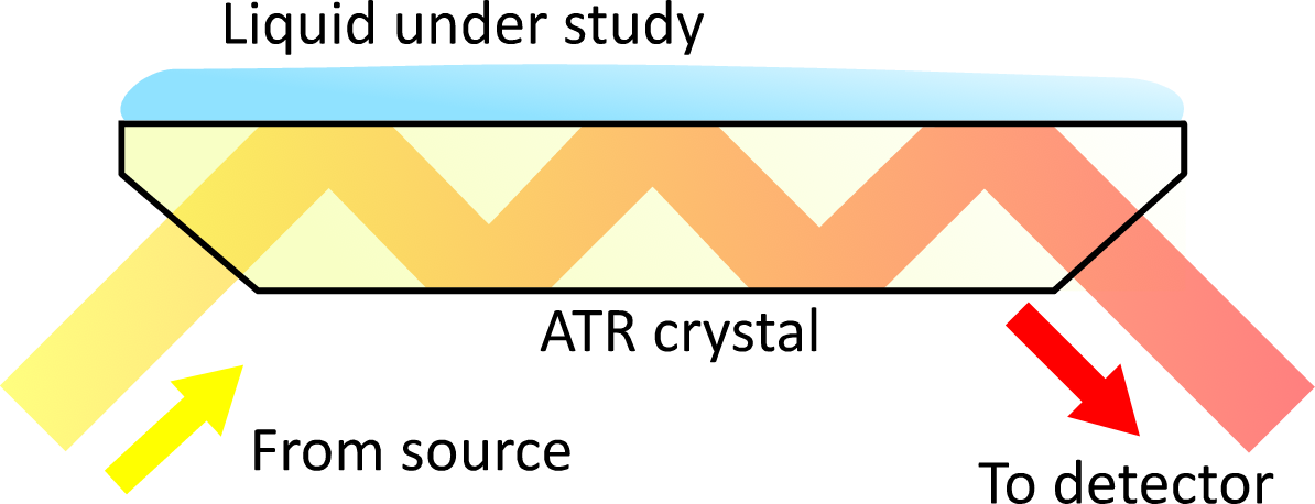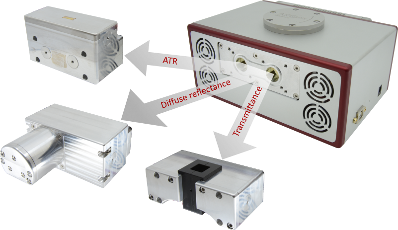 The ATR module consists of a 3 bounce ZnSe ATR crystal designed to measure liquids or suspended solutions. Thanks to the high throughput of this configuration and the high sensitivity of our thermoeletric cooled detectors, the FTIR-KIT-ATR enables all sorts of liquids to be used as buffer, including water !